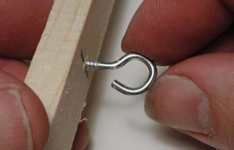 7) Lalu ambil poros dengan bentuk bulat. Coba masukan screw eye (kait gantungan baju) ke dalam poros. Ketika di masukkan, ukuran diameter screw eye harus lebih besar tapi jangan terlalu longgar juga agar poros turbin bisa berputar dengan baik.